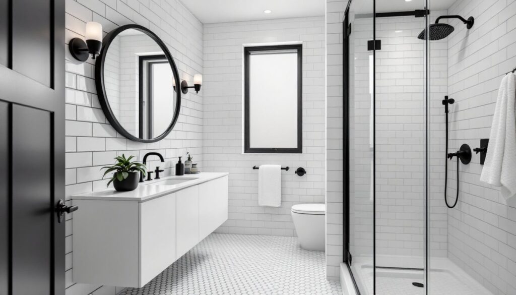 Subway tile remains the workhorse of monochrome bathrooms. Standard 3×6-inch white ceramic tile with black grout creates crisp contrast without overwhelming a small powder room. Running it in a horizontal brick pattern keeps costs down, vertical or herringbone layouts require more cuts and labor.