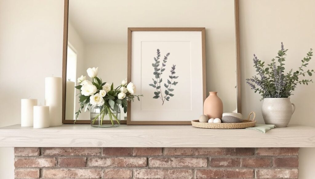 - Spring mantel decor ideas start with one dominant anchor piece like a mirror or framed artwork, positioned to occupy roughly two-thirds of the mantel width for balanced proportion.