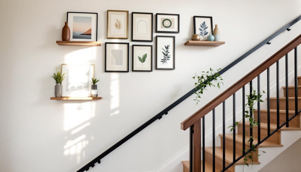 Floating shelves add functional depth to staircase walls, but installation differs from standard rooms. Load-bearing capacity is critical, shelves need to support not just decorative objects but also the occasional hand grab from someone losing balance.